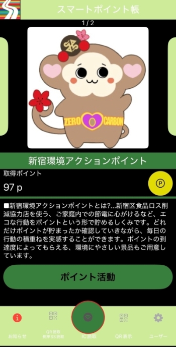 ポイントを貯めると新宿環境アクションポイントアプリの画面(もんぼんのイラスト)が表示されます。