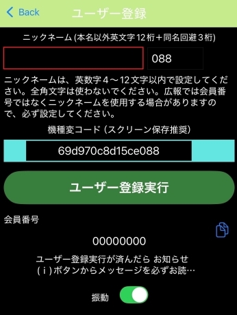 2.ユーザー登録画面で赤枠部分に、ニックネーム(英数字4~12桁)を入力し、「ユーザー登録実行」を押します。